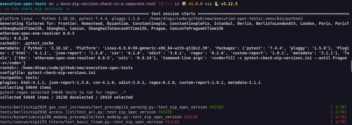 command-line utility automatically verifies that all EIP references in the codebase are current. It works by comparing the SHA specified in the test against the latest version in the ethereum/EIPs repository. This utility uses pytest to generate test cases for every module that includes "eip" in its path.