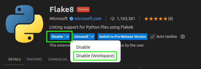 ms-pythonextensions are disabled for theexecution-spec-testsworkspace to ensure there are no conflicts with theruffformatter. In the VS Code Extensions tab, search for the each of the extensions below, and if installed and enabled, open the "Disabled" menu and select "Disable (Workspace)". This ensures that the extensions will be available with other workspaces that may need them.